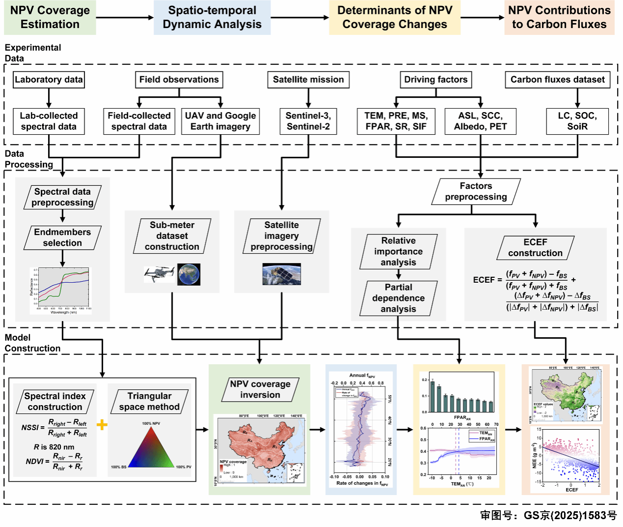 研究团队整合了Sentinel系列卫星影像与大规模野外实测数据,结合归一化差值植被指数(NDVI)与归一化土壤和裸土光谱分离指数(NSSI),利用光谱指数的三角形特征空间方法(Triangular Space Method),实现了2016–2024年全境300米分辨率的年度最大NPV覆盖度(fNPV)反演 。